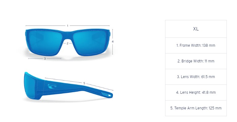 Costa sunglasses ‘fit’ guide is a range from Narrow, Regular to Wide with most people choosing Regular. Fit is a combination of both the size of the sunglasses and the features of the frame. The features such as the hinges and temple construction influence the way the sunglasses fit. Review the ‘fit’ guide to select a Costa sunglass frame that will be comfortable and perform for you.