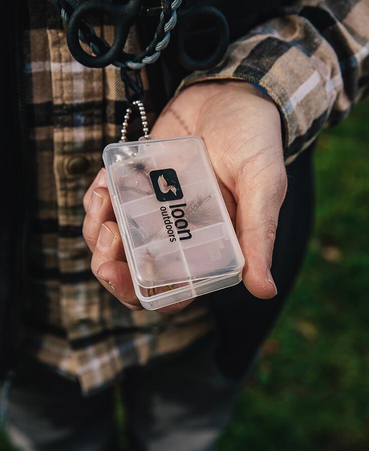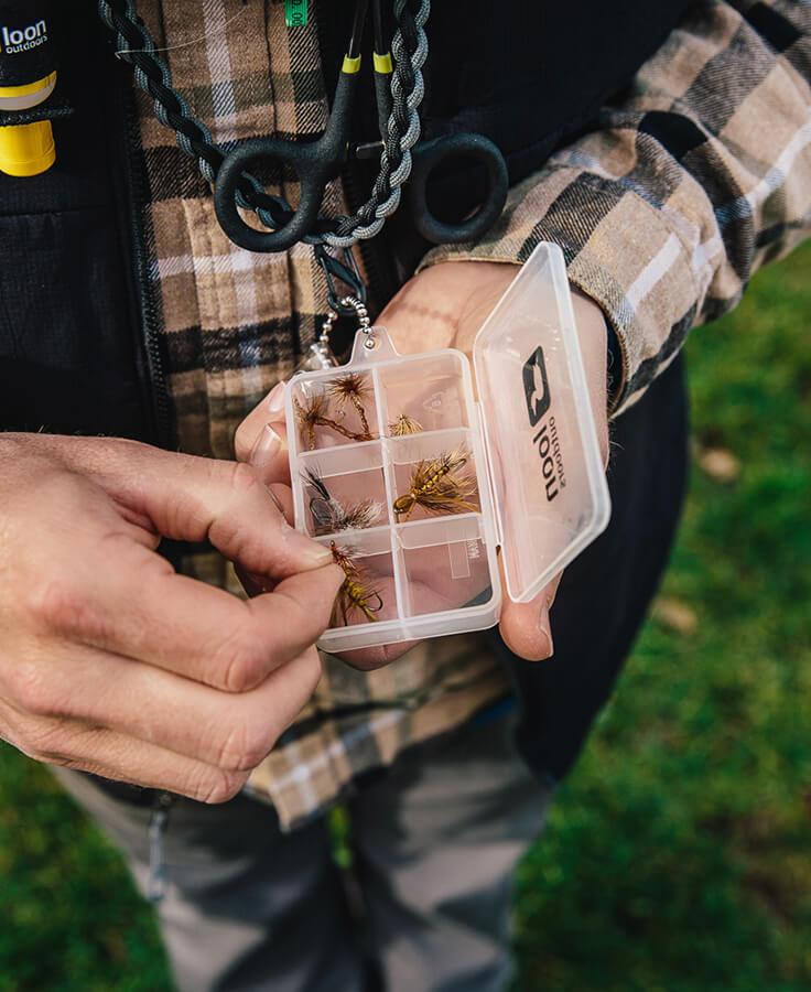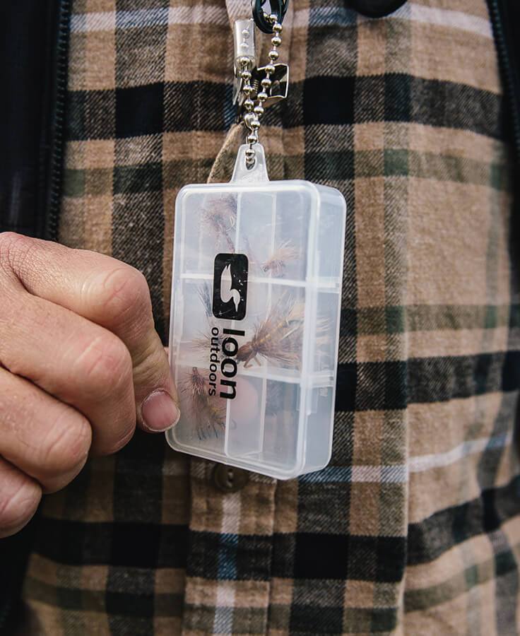 Six adjustable compartments keep the day’s “hot flies” close at hand. Attachment chain included.