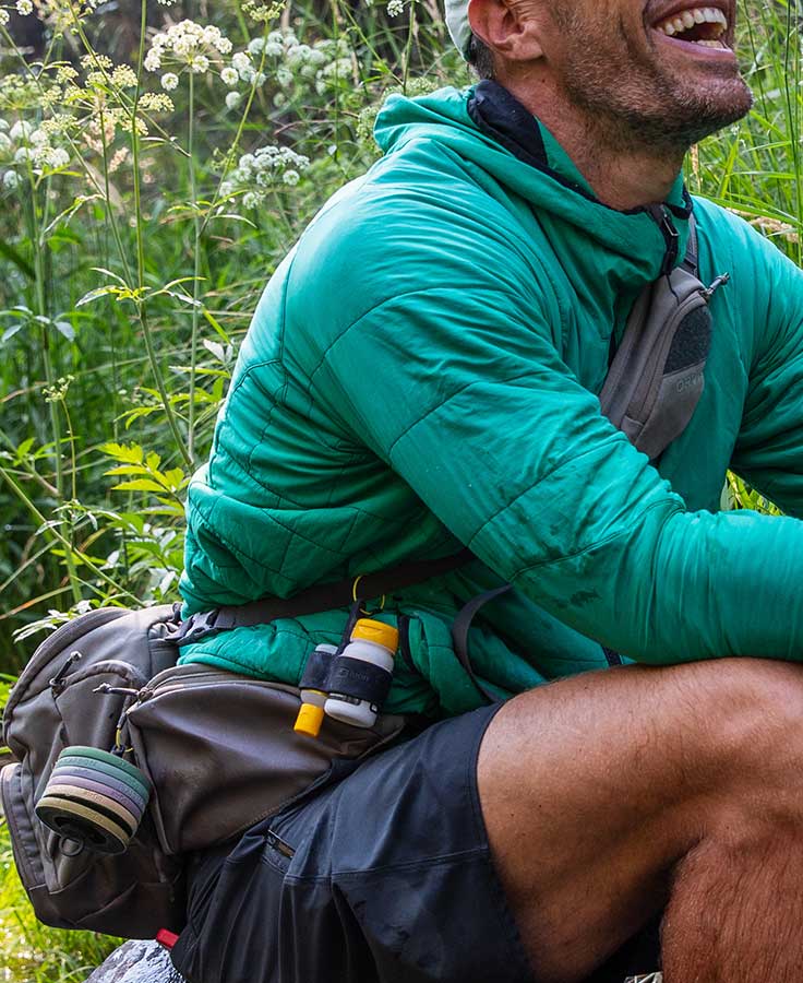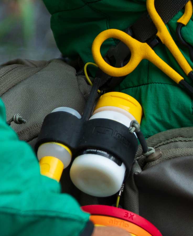 Heavy-duty, lightweight, indestructible and designed to carry two bottles of floatant, the Silicone Double Barrel Caddy securely fastens to any pack, bag or vest using a stainless steel tool tether, keeping your floatant right where you need it.