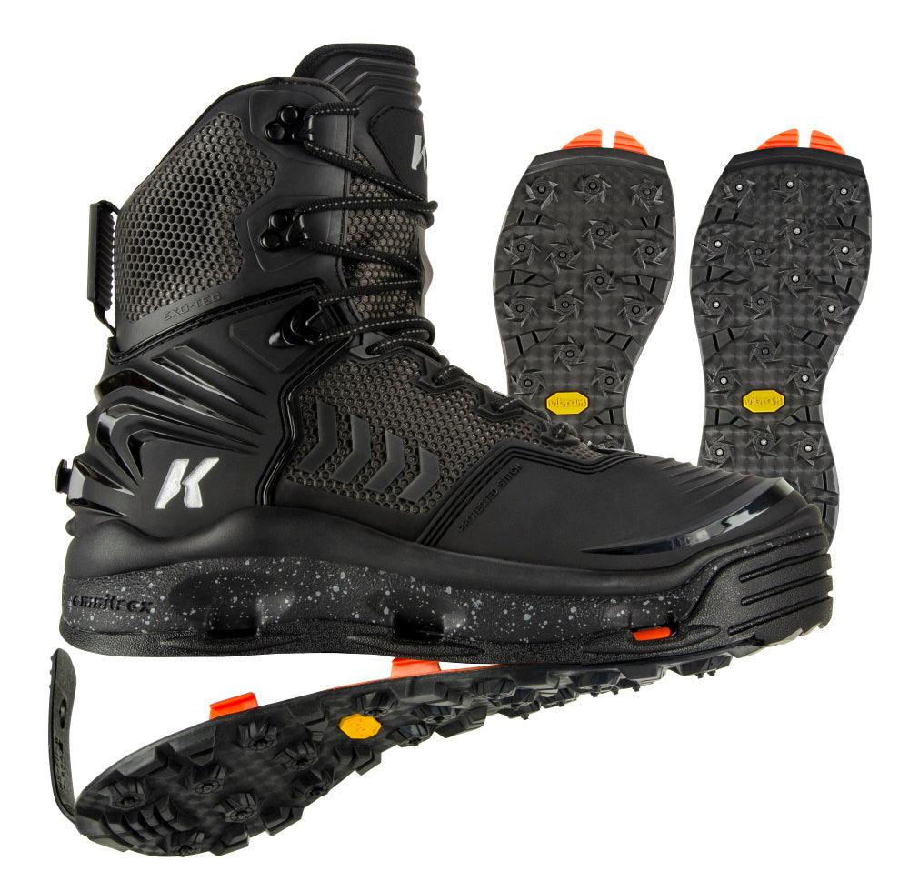 Traction: OmniTrax® Interchangeable Sole System adapts your traction to any fishing condition. Two sets of interchangeable soles included (premium Vibram® wet & dry rubber traction)