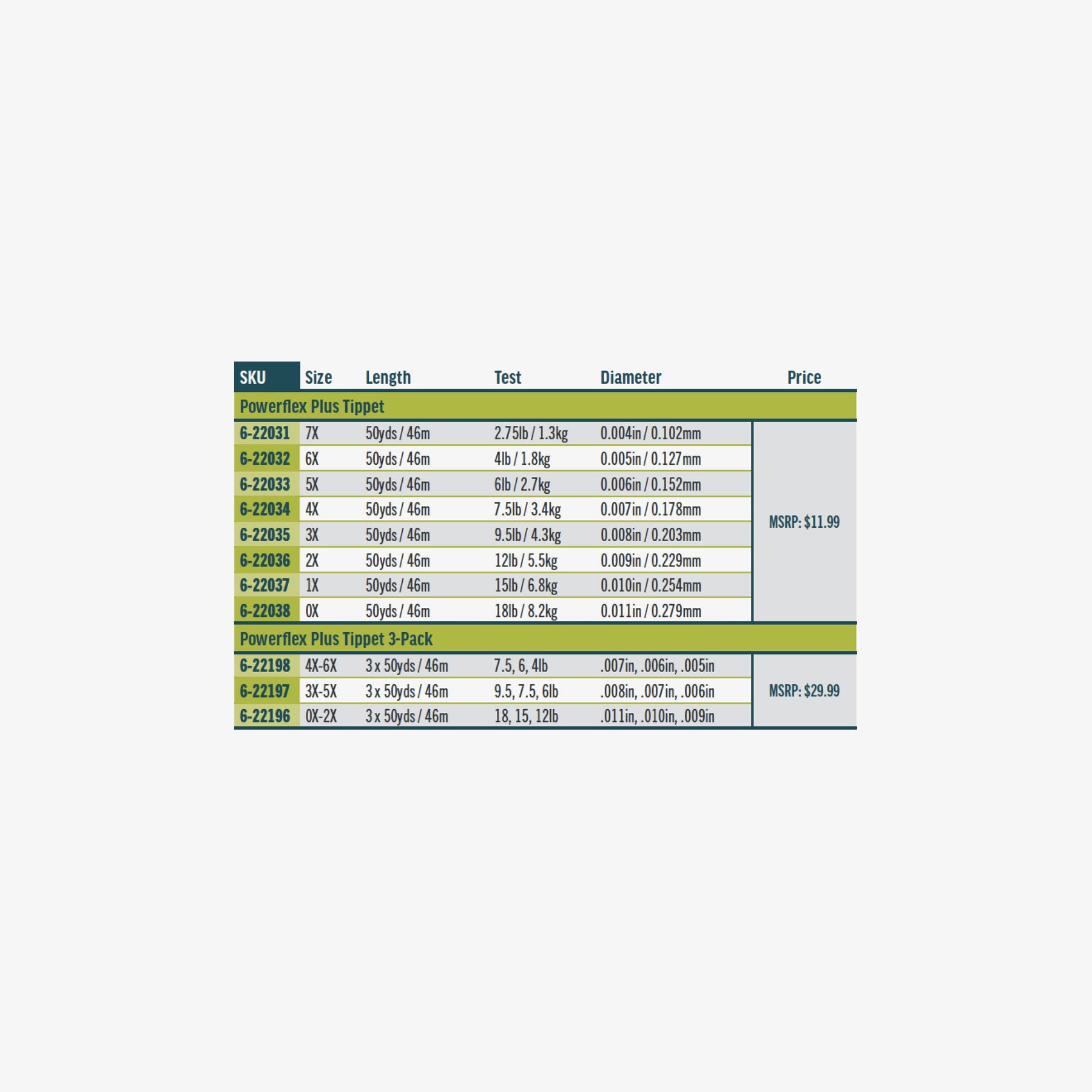 RIO'S Powerflex Plus Tippet is the strongest nylon tippet material ever made, with tensile strengths up to 20% more than regular tippet. A highly technical formulation of the nylon copolymer manufacturing process has resulted in this prodigious strength increase, without compromising knot strength or suppleness. Simply put, this is the strongest, most reliable tippet ever made.