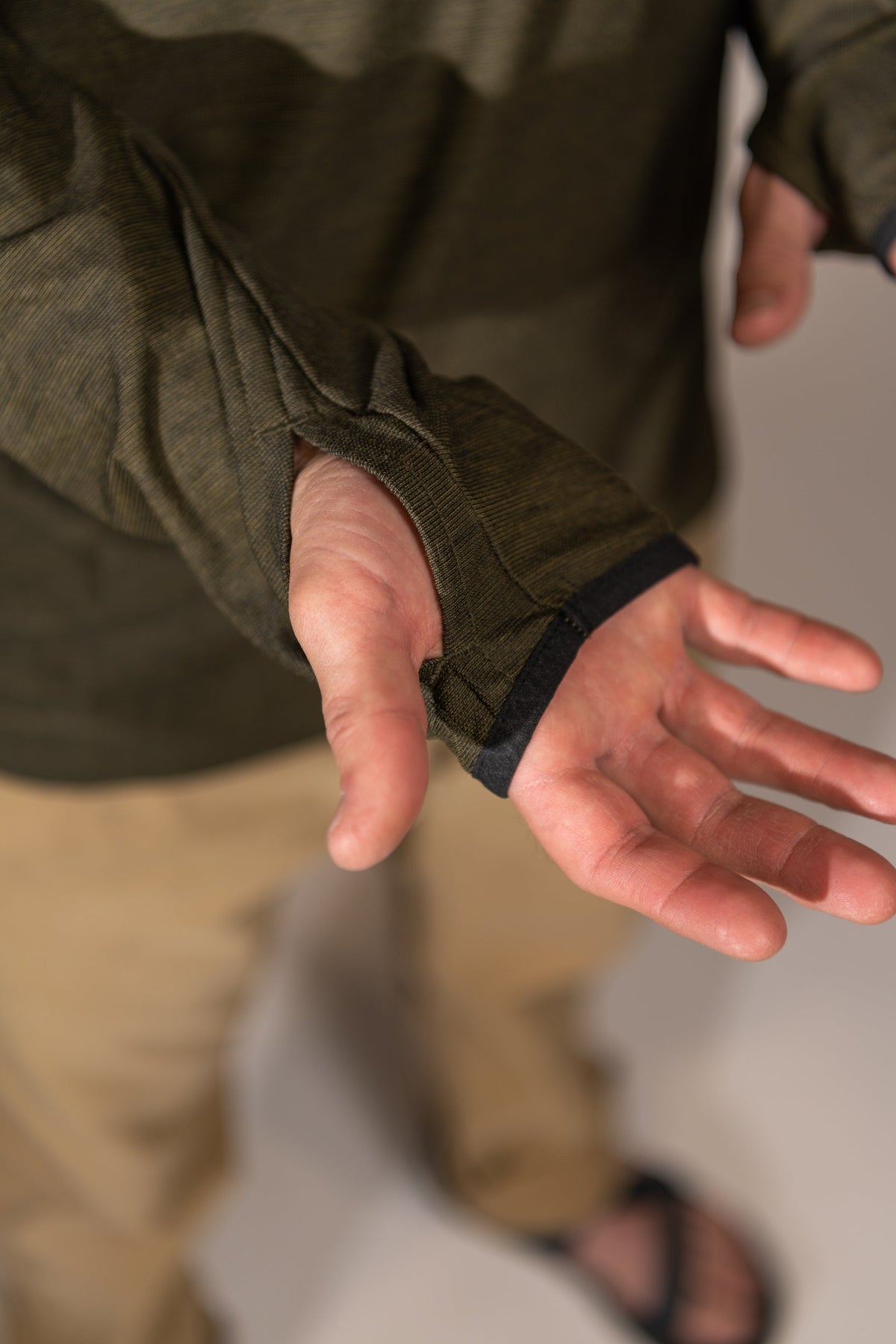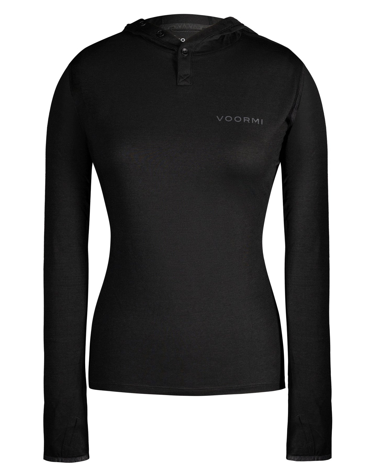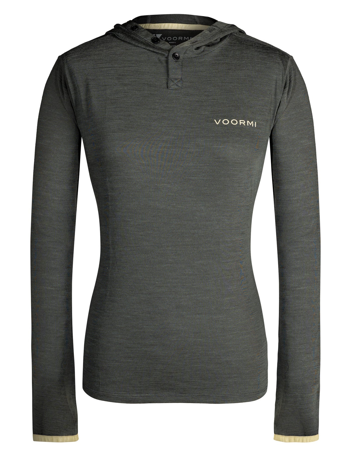 This sun protective layer features VOORMI's Dual Surface UL Precision blended wool, includes a button hood, thumb holes.