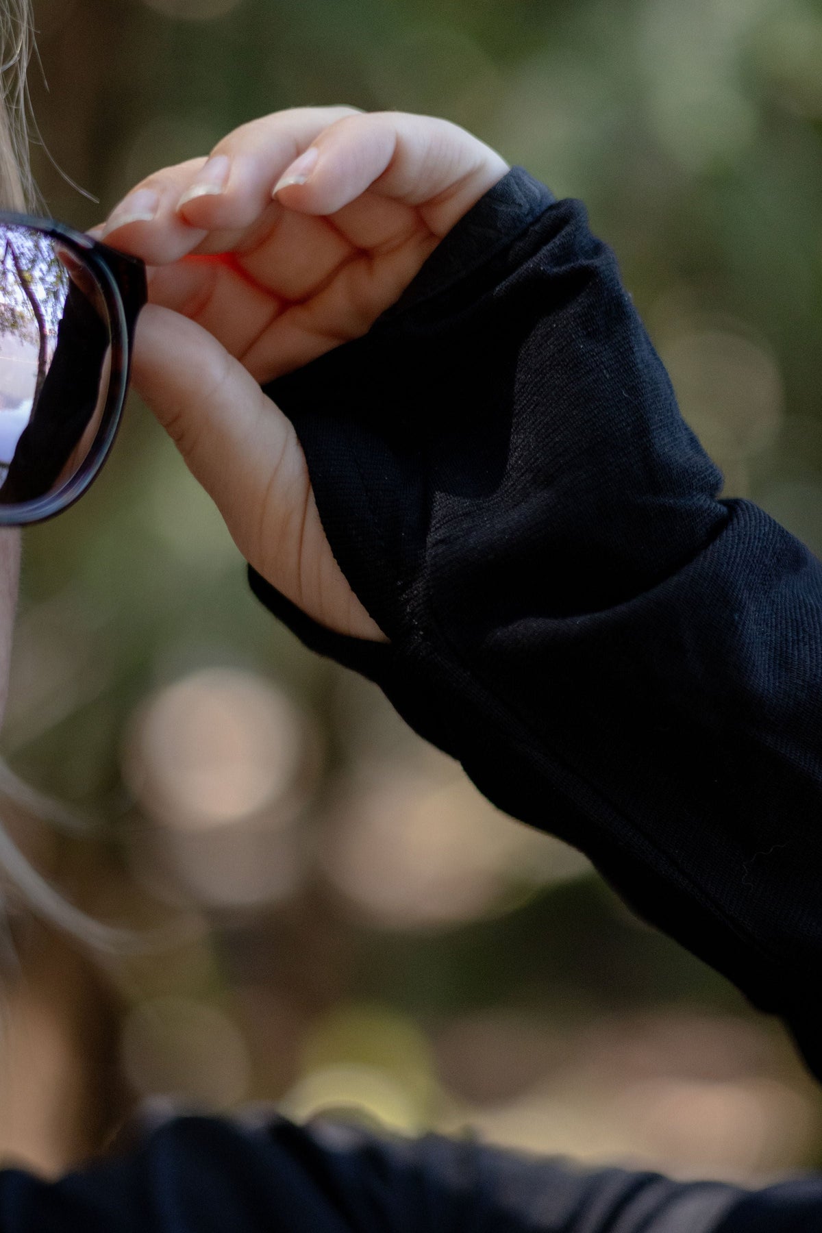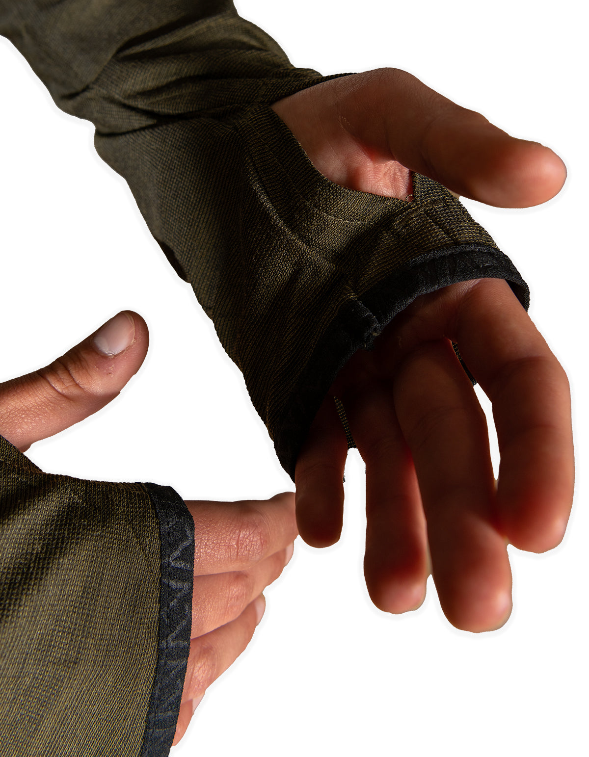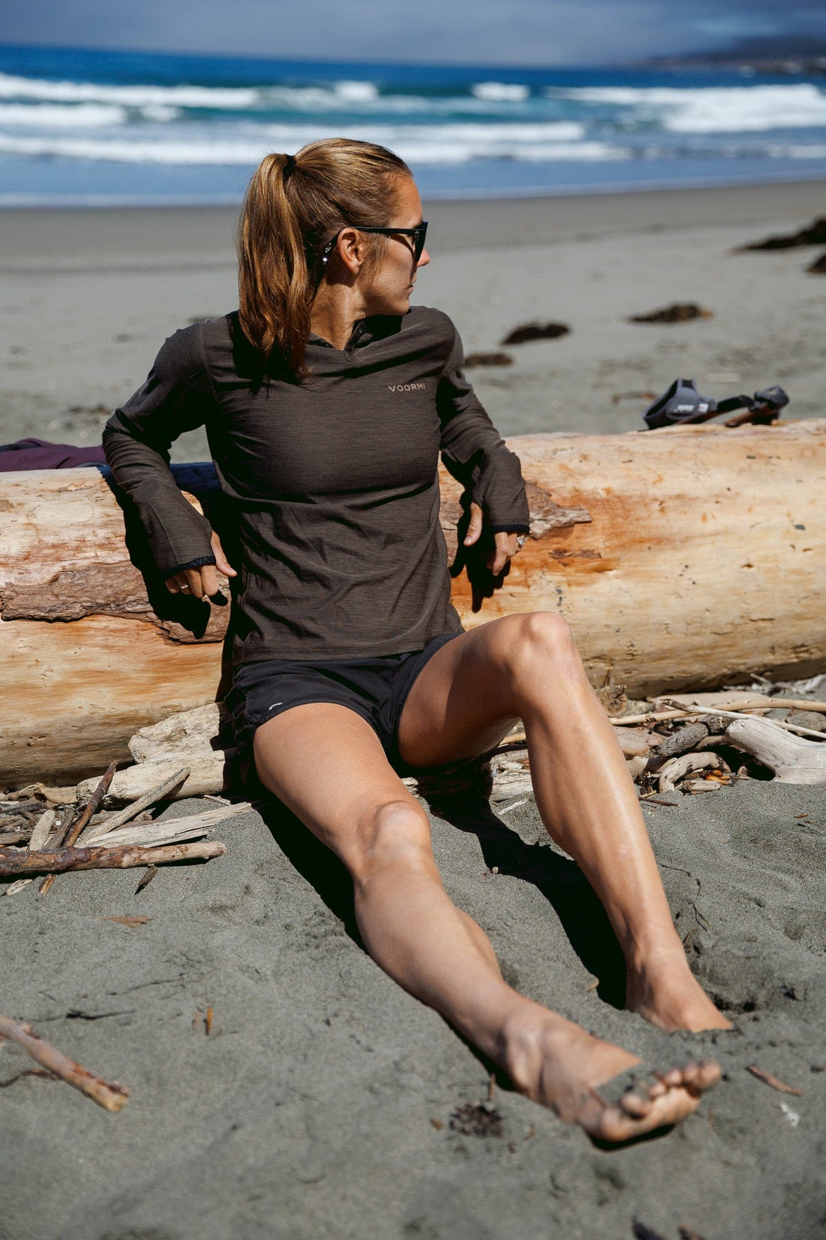 This sun protective layer features VOORMI's Dual Surface UL Precision blended wool, includes a button hood, thumb holes.